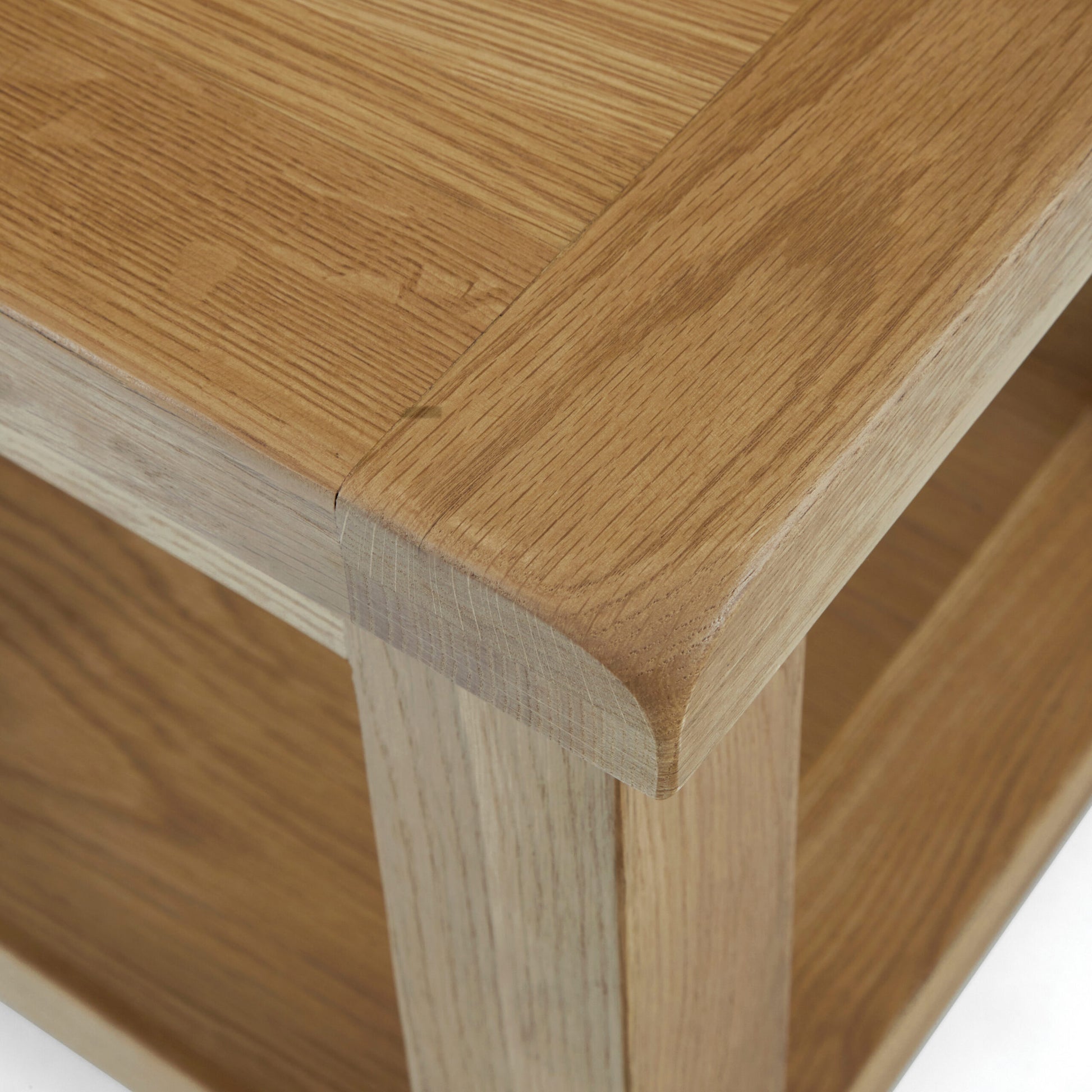 The solid oak tabletop offers the perfect spot for a lamp, decorative piece, or your morning coffee. Below, a low open shelf provides convenient storage or display space for books, baskets, or small accessories.